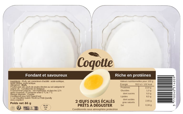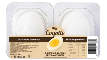 Coqotte, c’est 2 œufs durs prêt à déguster, idéal pour compléter rapidement votre repas en toute simplicité.